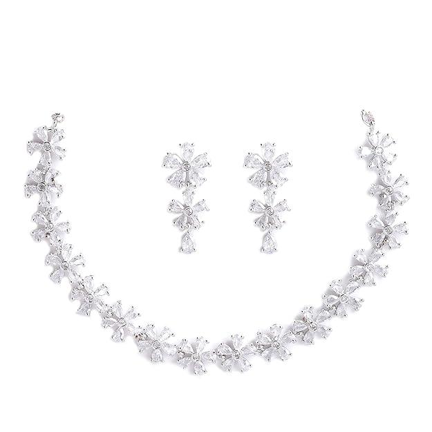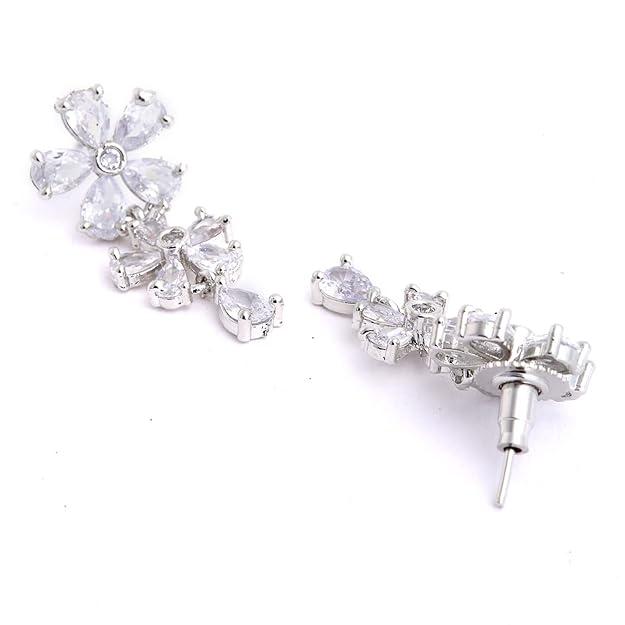 Silver Toned White American Diamond Studded Flower Shaped Jewellery Set For Girls and Women